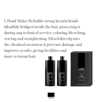 1 Bond Maker Rebuilds strong keratin bonds (disulfide bridges) inside the hair, protecting it during any technical service: coloring, bleaching, waving, straightening. Mixed directly into the chemical treatment it prevents damages and improves results, giving healthier and more resistant hair.